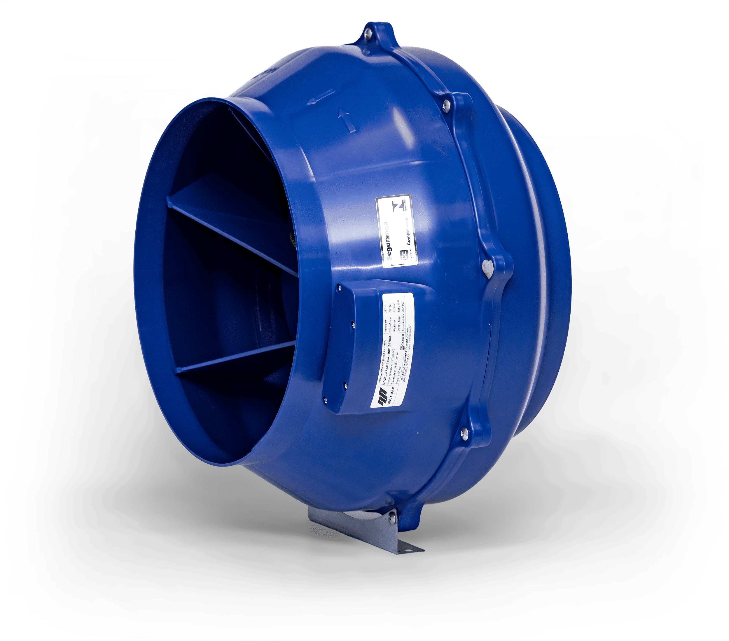 Ventilador centrífugo em linha com corpo de polipropileno, motor de rotor externo e pás curvadas para trás. Equipado com motor monofásico com proteção térmica interna.