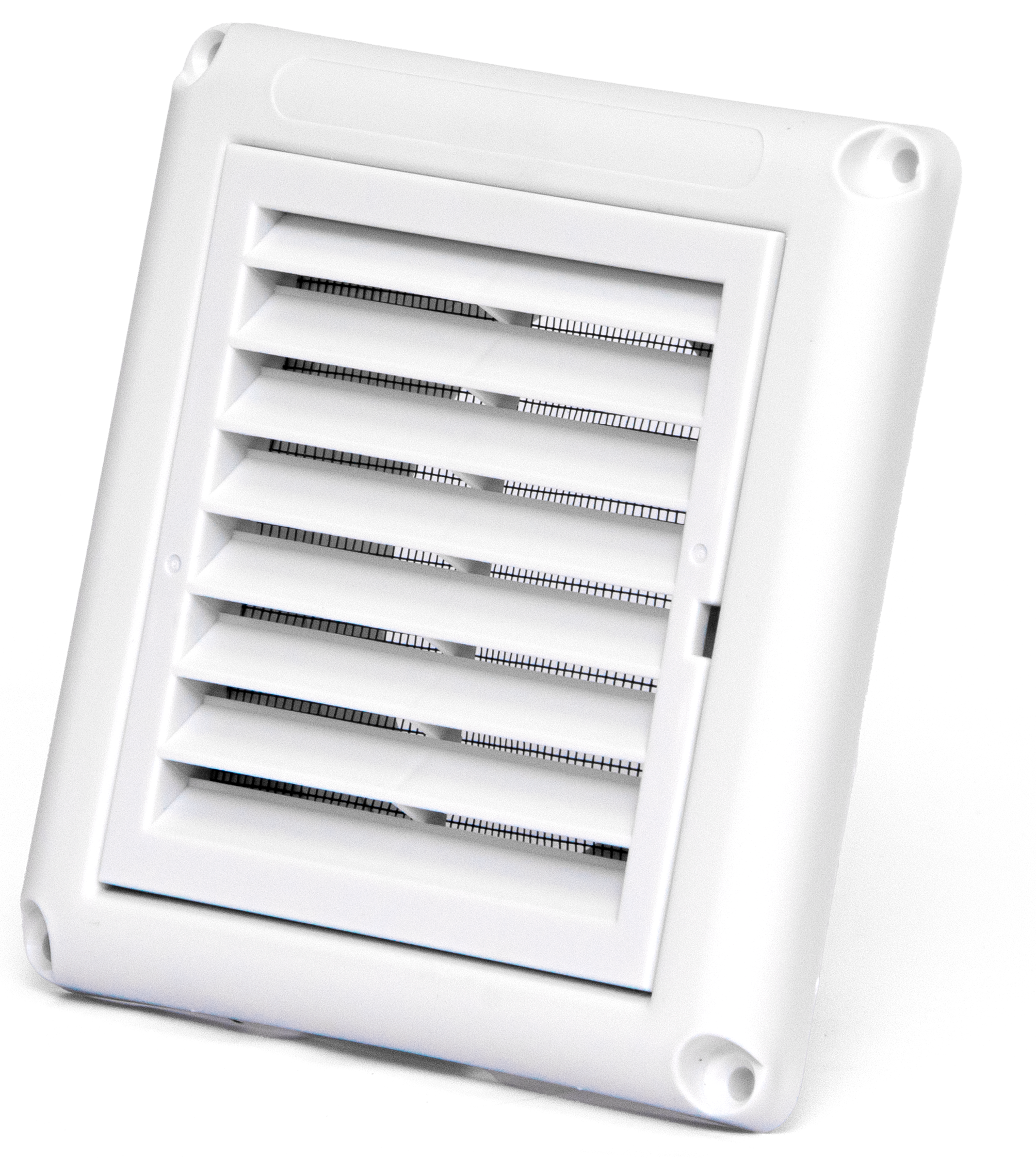 Grelhas para instalação na fachada para acabamento de pontos de descargas de ar do sistema de exaustão. Com aletas fixas e tela anti-inseto.